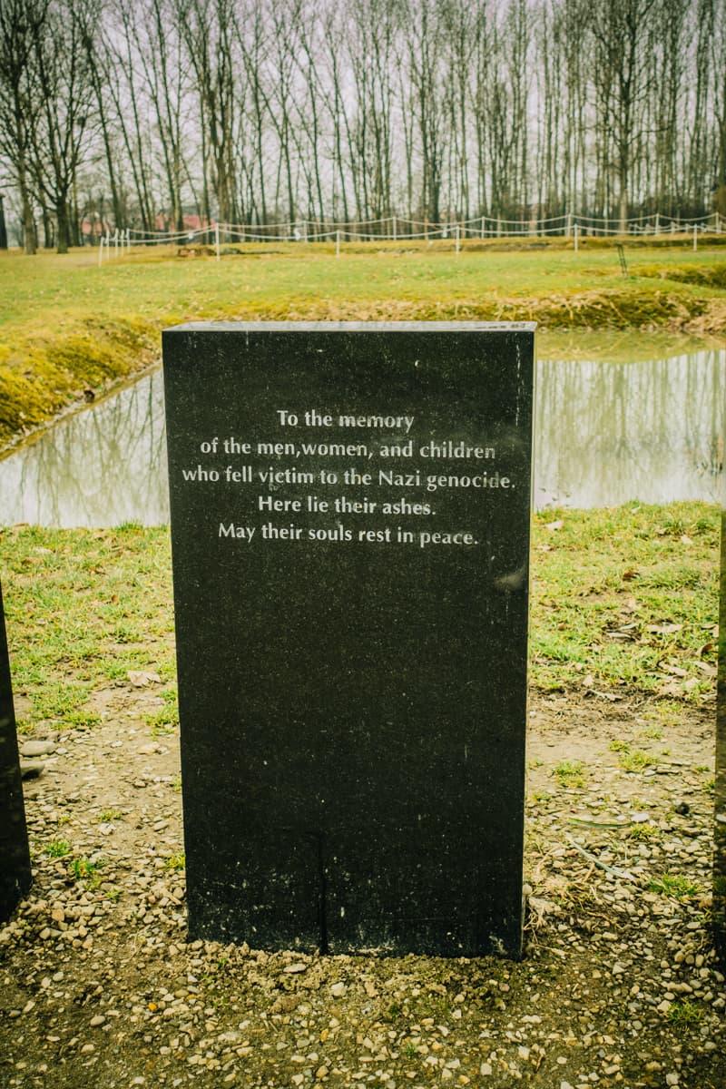 Achteraan vind je het herdenkingsmonument. Dit bestaat uit 1,5 miljoen kasseien, om toch maar op een manier te proberen visualiseren hoeveel mensen hier het leven lieten. Eerlijk waar, we waren alle drie opgelucht toen we weer gewoon door de poort naar buiten konden stappen, veilig en warm in onze auto. Hop naar Slowakije, ver weg hier vandaan.