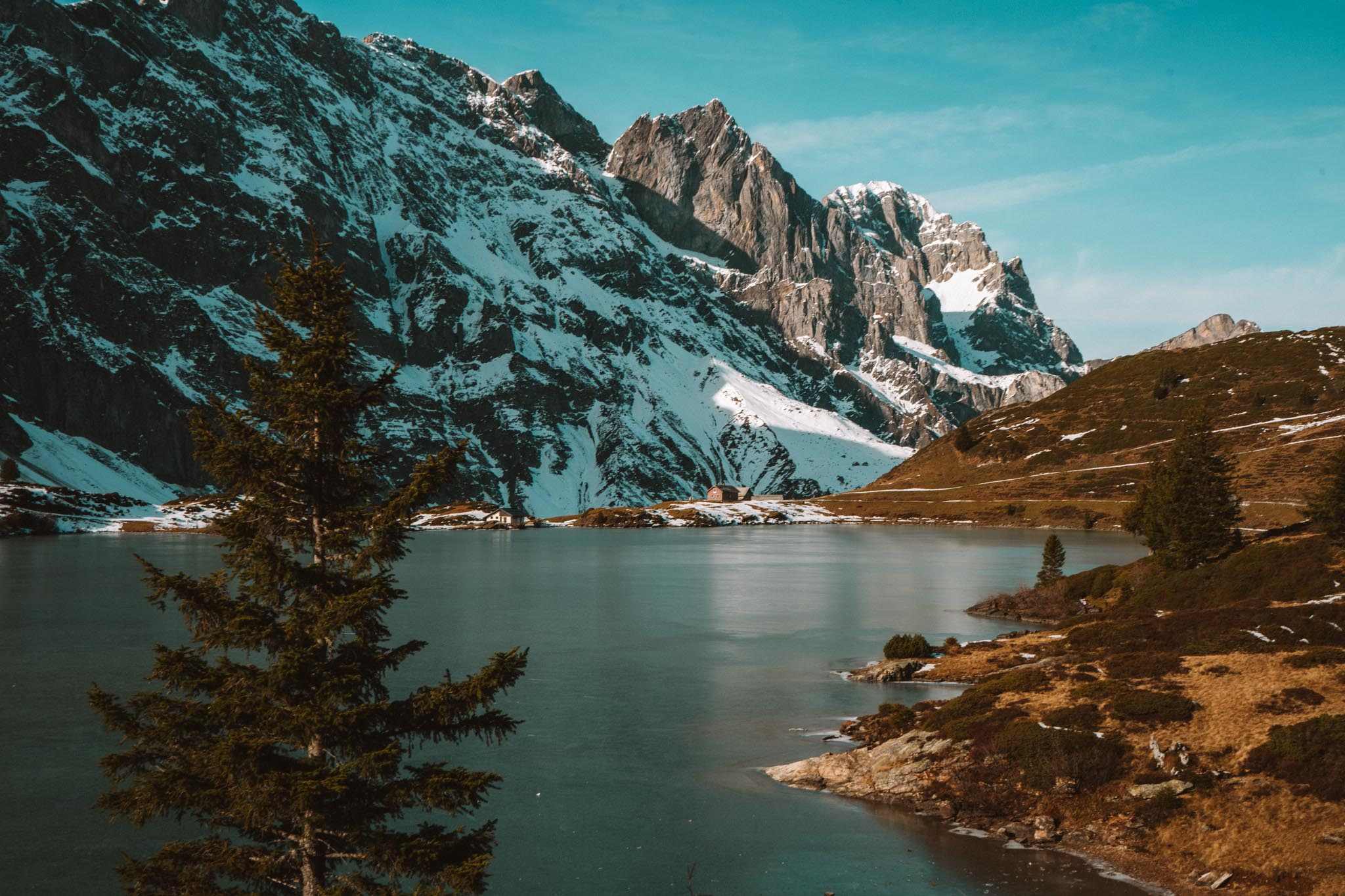 Titlis konden we helaas niet beklimmen — de gondel was under construction — dus stapten we een halte vroeger uit, bij Trübsee. Een oogverblindend (letterlijk) meer, verborgen tussen de besneeuwde toppen van het Titlisgebergte. Wandelen doe je in een klein uurtje rond het meer, met de optie om halfweg te voet af te dalen richting Engelberg. Die optie kozen wij.