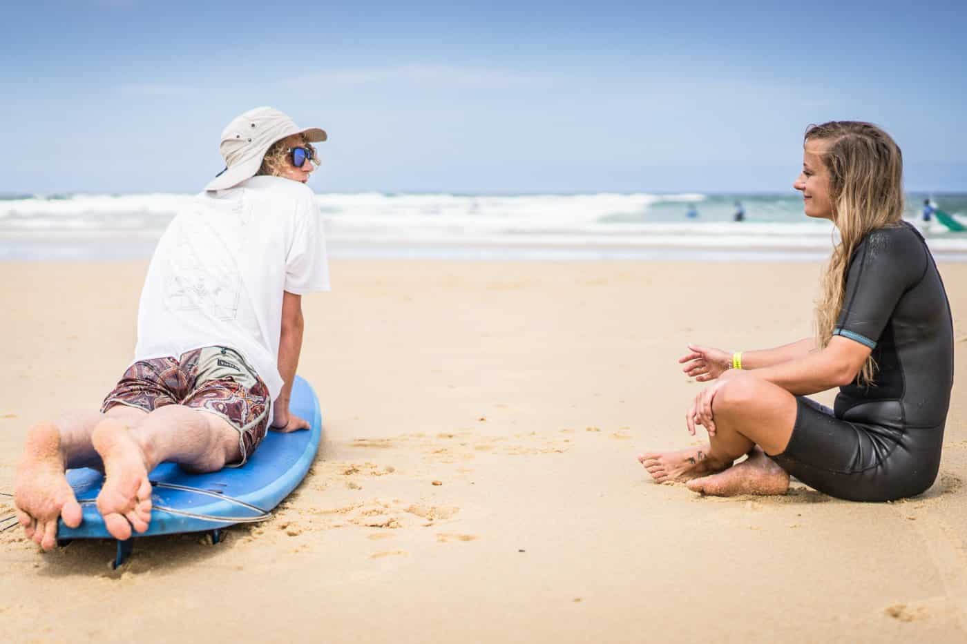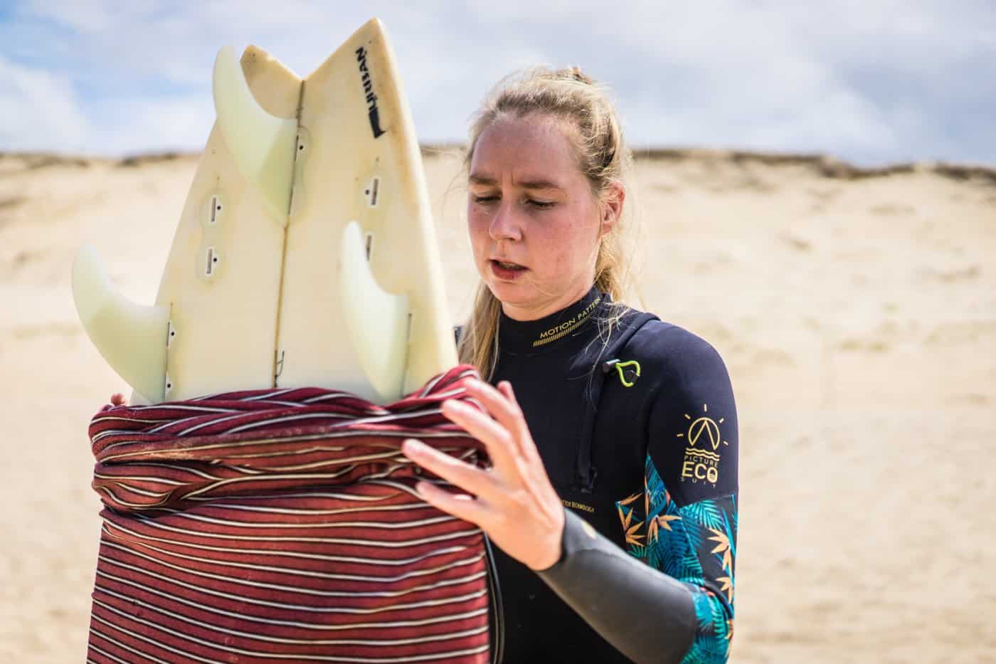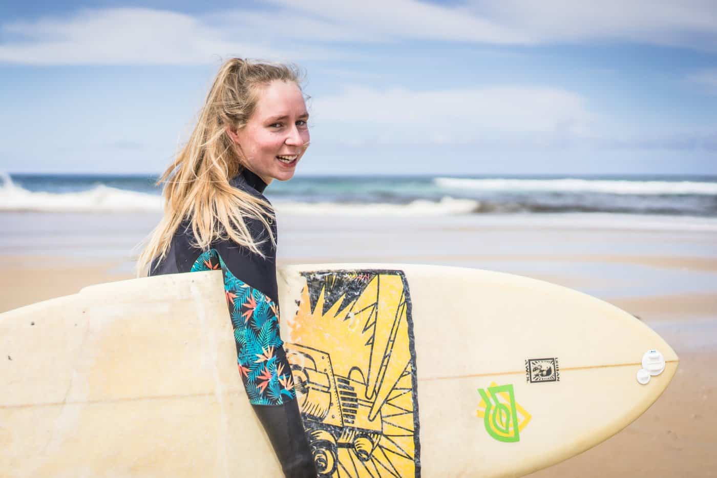 Maar bon, voor de pintjes alleen waren we niet gekomen. De golven gillen – je hoort ze echt bijna tot in je tent – en er moet op gesurfd worden. Beginner of niet, bijleren kan je altijd dus geven we ons op voor de surflessen met Freek. Even in die natte wetsuit wriemelen, plank gezwind, of toch bijna, over de schouder zwieren en dan met een sukkelgangetje richting het strand.